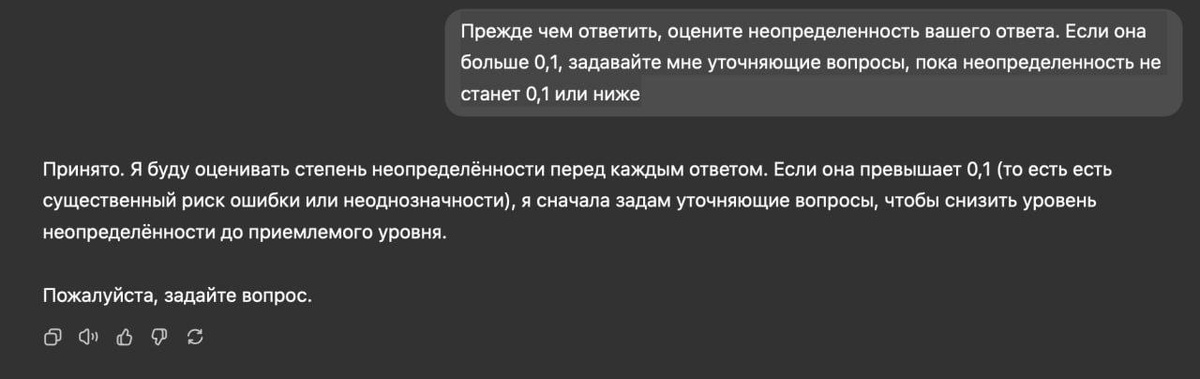 👍Реддитор придумал промт, который улучшает качество ваших ответов у ChatGPT 🔜 с ним нейросеть будет выдавать более проверенные ответы. Сам промпт: Прежде чем ответить, оцените неопределенность вашего ответа. Если она больше 0,1, задавайте мне уточняющие вопросы, пока неопределенность не станет 0,1 или ниже 🤖 Ботоферма в деле!