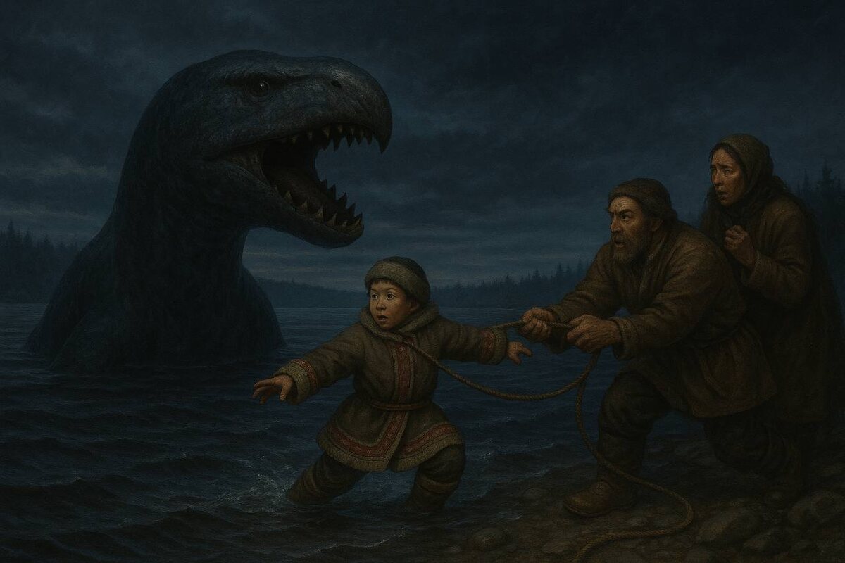 Где-то в сердце Якутии, на берегу сурового озера Лабынкыр, люди до сих пор шепотом вспоминают о «черте». Так местные зовут загадочное существо, похожее на монстра. И хотя большинство считает это легендой, описания очевидцев пугающе совпадают. «Огромное, темно-серое, с такой большой головой, что расстояние между глазами меньше длины традиционного плота из 10 бревен», — так описывали его разные свидетели. Вот лишь три из множества историй, которые были задокументированы и научно подтверждены. Подробнее о тайне происхождения, научных экспедициях по поиску чудища и возможных версиях я писала: здесь. Пасть размером с всадника Семья эвенков кочевала на летние угодья. Вечером они остановились у берега Лабынкыра. Пока взрослые готовились к ночлегу, мальчик играл у ручья. Вдруг он закричал — взрослые увидели, как течение несёт его в озеро. Они бросились спасать, но внезапно из глубины вынырнуло темное существо, длиной около пяти-шести аршин (3,5–4,2 метра). Оно схватило мальчика пастью, похож