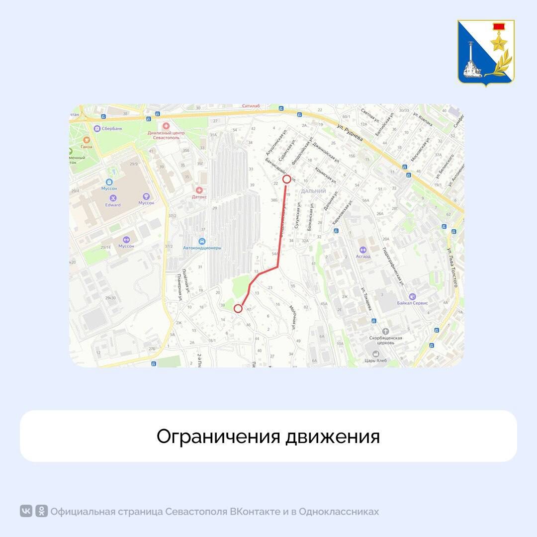 Временные ограничения движения С 7 июля по 20 ноября будет перекрыт участок от ул. Феодосийской, 13 до ул. Колодезной, 50А для проведения дорожных работ. 🍂Проехать смогут только экстренные службы, местные жители и работники организаций в этой зоне. Планируйте маршрут заранее. Правительство Севастополя