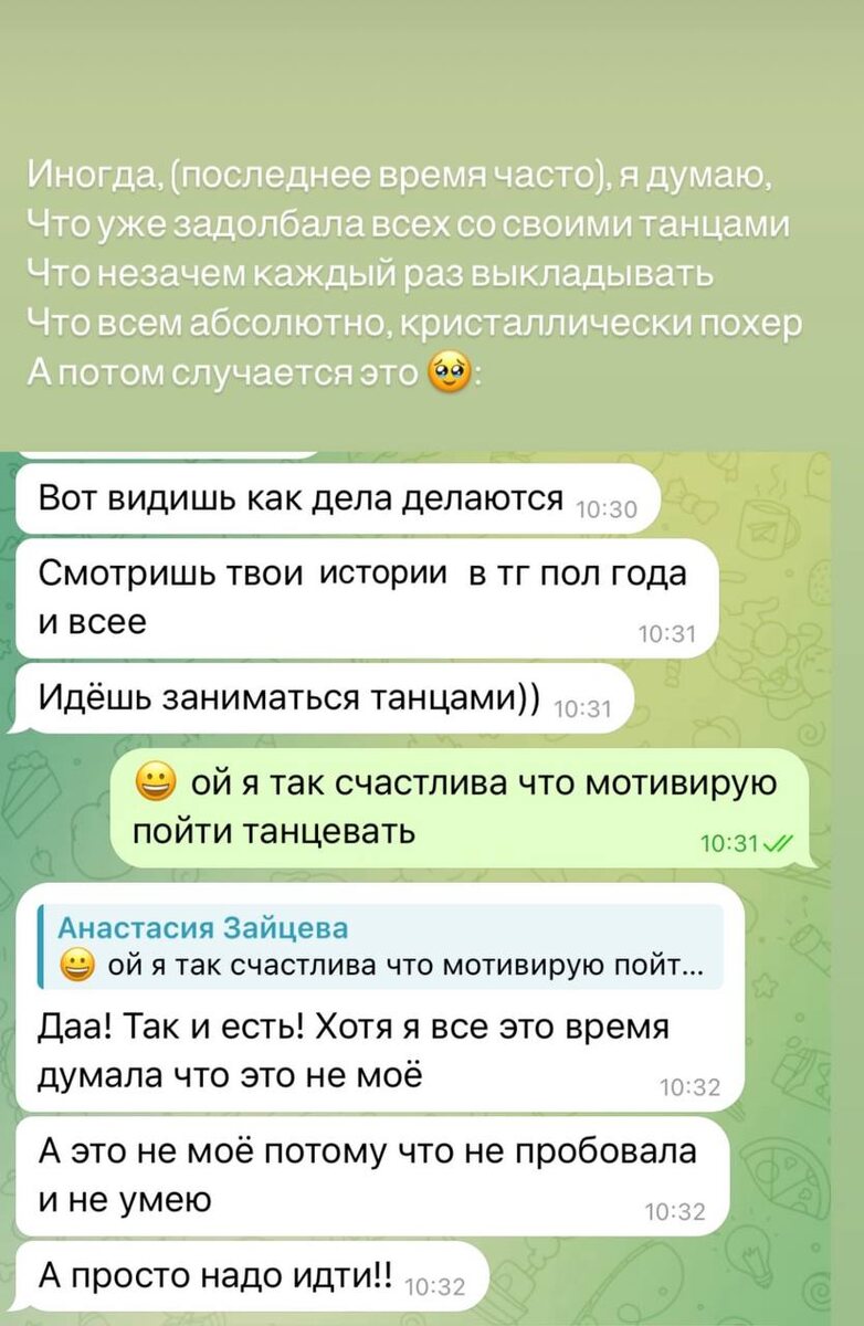 Под прошлым постом пошел срачь в коментариях Давайте не ссорится мои любители тревоги ❤️ Минутка утренний мотивашки вам. Моя жена занимается танцами и очень от этого кайфует Ей даже не приходило в голову начать вести курсы танцам и что это кому то интересно Как и мне в свое время с психотерапией я просто решил попробовать вести свой блог. Но частенько кажется что делаешь банальные вещи С чего это должны смотреть или слушать Тем более идти как клиенты Если вам очень хочется чем то заняться но вам кажется кто будет это смотреть,слушать,покупать. Просто попробуйте и начните делать от чего получаете удовольствие и подумать как это можно монетизировать Давайте поможем друг другу в комментариях ⬇️❤️ И поддержим мою жену чтобы она открыла свой кружок по танцам 😀