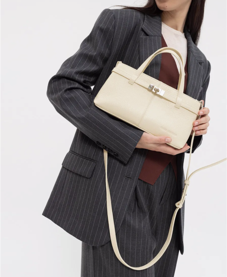 Светлая сумочка очень нужна в летнем гардеробе, вот такая отлично подойдёт. Она не очень большая, но вместительная. А ещё сумки с ремнями- один из трендов. Здесь ремень не броский, а сама сумка базовая, поэтому даже когда тренд пройдёт, она не будет выглядеть устаревшей.