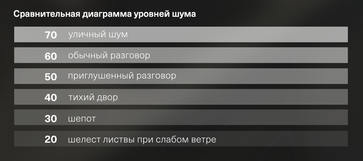 Сегодня в рубрике «Запрос — решение» мы рассмотрим несколько моделей эффективных, производительных и мощных вытяжек, которые при этом работают с минимальным уровнем шума. Запрос от клиента звучит так: «Посоветуйте модель мощной вытяжки, которая бы хорошо справлялась со своей задачей: очищала воздух от всех запахов и дыма, и при этом работала тихо». В одной из предыдущих статей рубрики мы подбирали мощную вытяжку для студии и квартиры с европланировкой. Сегодня в обзоре акцент именно на тихой работе и высокой производительности. Для начала хорошо бы разобраться (хотя бы примерно представлять), что значит тихая вытяжка и какой уровень шума считать минимальным. Для удобства приводим такую диаграмму. Цифры слева — это децибелы, в них измеряется громкость звука. Допускаем, что это усредненные значения. И нужно учитывать субъективное восприятие: для двух разных людей один источник шума может быть как очень громким, так и вполне нормальным. В нашей подборке 4 модели. Три из них с инверторным