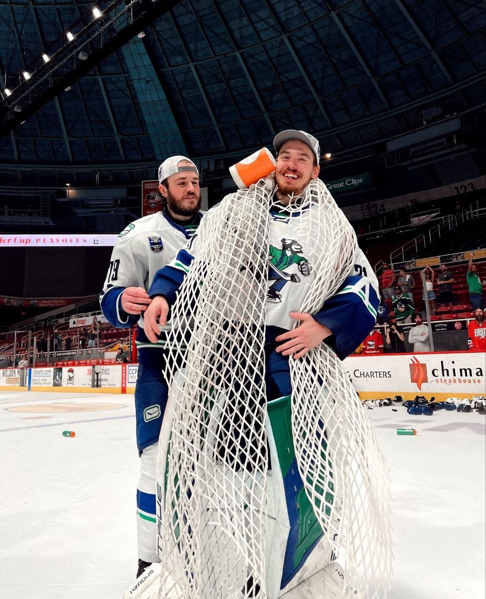 Вратарь фарм-клуба «Ванкувера» ⚔ Артур Шилов настолько был рад победе в финале АХЛ, что надел на себя сетку ворот