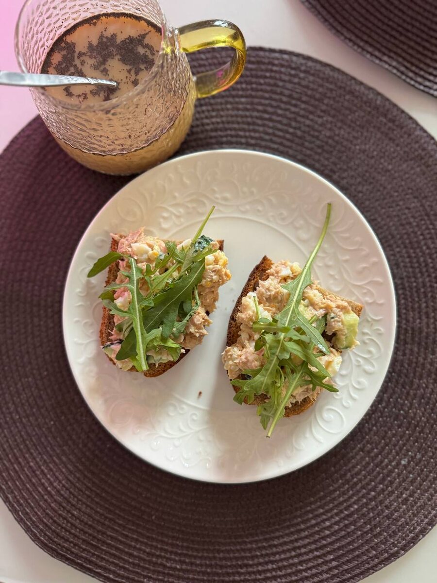 🤩🤩🤩☀️ Сегодня у меня на завтрак были вкусные, сытные и сбалансированные бутерброды 😍 Кто меня давно читает, тот уже знает их рецепт. Кто не знает, очень советую попробовать 🤌🏻 🟣ЦЗ хлеб обжарить (я в тостере) 🟣2 яйца в крутую раздавить вилкой 🟣добавить нарезанный кубиками огурец или помидор 🟣добавить консервированного тунца в собственном соку (сок слить) 🟣добавить греческий йогурт 🟣все перемешать и выложить на хлеб 🌼сверху можно положить зеленушку. Хватает на 4-6 порций 👌🏻
