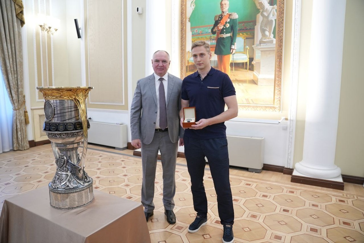 Порадуемся Кубку! Кубок Гагарина, главный трофей Континентальной хоккейной лиги, который в этом сезоне выиграл ярославский «Локомотив», побывал в управлении МЖД. 👍 Награду привёз нападающий хоккейного клуба Максим Шалунов. Именно он забросил победную шайбу в овертайме пятого матча финальной серии плей-офф в ворота челябинского «Трактора». 🤝 Во время торжественной церемонии встречи кубка начальник МЖД Павел Иванов поблагодарил всю хоккейную команду за доставленные положительные эмоции. «Несмотря на сложный график, мы всегда находим время, чтобы посмотреть на игру любимой команды. И ваши успехи заряжают нас энергией, помогают добиваться высоких результатов в нашей работе», - отметил Павел Иванов. В знак признательности и на память об этой встрече он вручил хоккеисту часы начальника дороги. В свою очередь, Максим Шалунов поблагодарил всех за поддержку. «Благодарю за приглашение и возможность встретиться с коллективом московских железнодорожников. Мне очень приятно находиться в сам