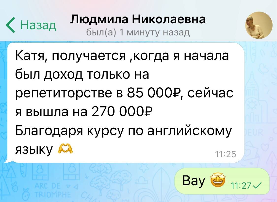 Я не брала новых учеников. Но теперь зарабатываю в 3 раза больше Если вы учитель или репетитор, который уже работает онлайн, но всё ещё зарабатывает около 80–90 тысяч, не хочется набирать больше учеников, эта история для вас. Людмила Николаевна преподаватель английского языка. Работала с детьми в мини-группах и индивидуально. Параллельно вела занятия в детском центре (для души). Доход с репетиторства был 85 000₽. Центр много не приносил. Хотелось больше, но без перегруза. И просто увеличить цену или нагрузку не вариант. Как она вышла на 270 000₽? Шаг 1️⃣. Разобрались с темой курса Мы проанализировали рынок и собрали обратную связь от родителей. Выяснилось: детям не хватает реальной практики - говорить, понимать, читать на английском. Школьный английский есть, а в обычной ситуации они теряются. Так появилась идея курса: 👉 английский, который помогает читать, понимать и говорить в реальной жизни. Шаг 2️⃣. Проверили спрос Провели опрос среди родителей текущих учеников. Спрос был!