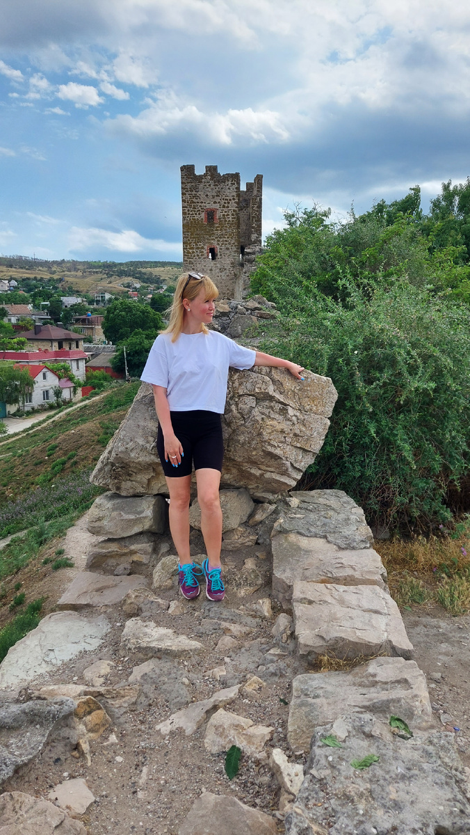 К 19 часам вечера мы проехали злосчастный серпантин и намотали уже 41 час в дороге за эти 4 дня. К 11 вечера подъехали к досмотру на Крымском мосту. Прошли быстро, но пришлось вынимать все 100 баулов и проносить через рамку. Дорога пустая, мост тоже. Наконец жильё, которое могу рекомендовать. Двухкомнатная квартира со свежим ремонтом и мебелью. 4500р. в сутки. 9 минут ходьбы до отличного песчаного пляжа. Это берег Азовского моря. Особенно хорошо, для детей так как не глубоко. 2 лежака с зонтиком 800 р в сутки. Мы взяли абонемент и вышло 600. Обгорели в первый же день - база для изголодавшегося по солнцу питерца. На второй день поехали посмотреть Генуэзскую крепость (Кафа) в Феодосии. Тут же храмы. Всё 13-14 века. Вход свободный. Даже на службу попала. Неподалеку башня Фомы, но туда не пустили злые собаки. А до другой башни мы не доехали т.к. мне позвонил клиент и я не смогла быть штурманом, потерялись. Имейте в виду, что новигатор не будет работать бОльшую часть времени на полуост