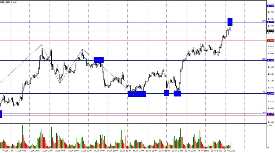 https://basechop.ru/wordpress/?p=48083 Добрый день, уважаемые трейдеры! Пара EUR/USD в среду продолжала процесс роста, а в четверг утром достигла уровень коррекции 127,2% – 1,1712. Отбой котировок от этого уровня позволяет рассчитывать на разворот в пользу американской валюты и некоторое падение в направлении уровней 1,1645 и 1,1574. Закрепление курса пары над уровнем 1,1712 повысит вероятность дальнейшего роста евровалюты в направлении следующего уровня 1,1802. Ситуация с волнами на часовом графике остается простой и понятной. Последняя завершенная волна вниз пробила лоу предыдущей волны, а новая волна вверх пробила предыдущий пик. Таким образом, в данное время тренд вновь поменялся на «бычий». Отсутствие реального прогресса в переговорах США–КНР и США–ЕС вынуждает медведей не спешить с атаками, заседание ФРС не помогло американской валюте, конфликт на Ближнем Востоке пользы доллару не принес. Как я и ожидал, «медвежий» тренд не получился сильным и длительным. Информационный фон в…