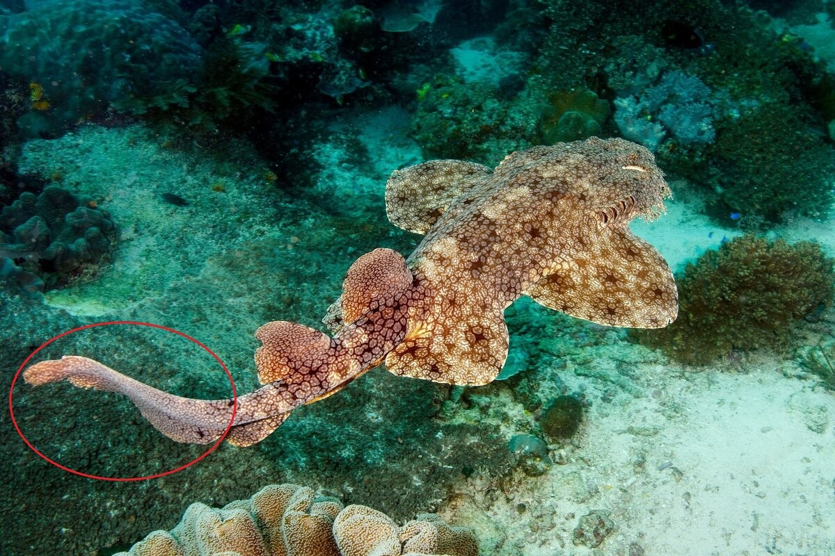 Бородатый воббегонг лежит на песке так тихо, будто его вылепили из того же известняка, что и риф. Узоры на спине напоминают выцветший персидский ковёр, бахрома из кожистых отростков сливается с водорослями.