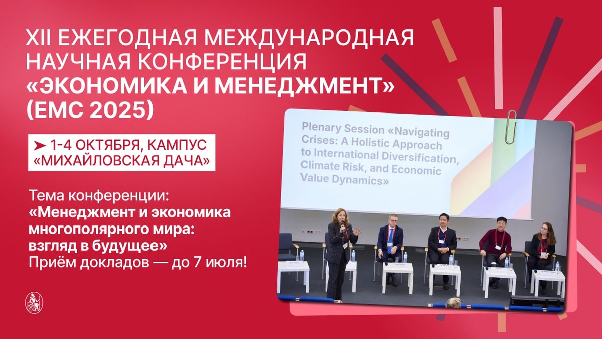 🔔 С 1 по 4 октября в кампусе «Михайловская дача» пройдёт XII ежегодная международная научная конференция «Экономика и менеджмент» (EMC-2025). Тема этого года — «Менеджмент и экономика многополярного мира: взгляд в будущее».