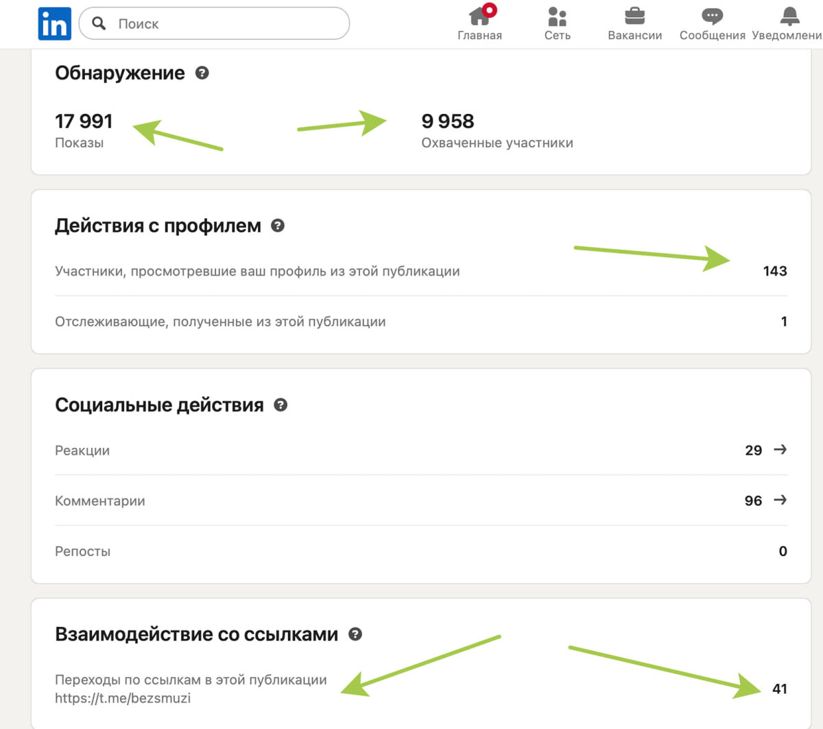 Аналитика одного моего поста в запрещенной соц.сети LinkedIn - я подсветил на картинке самое важное. Это просто один пост, который смог зацепить тонкие струны аудитории. Обычно цифры меньше.