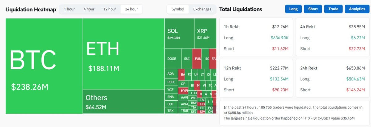 За прошлые сутки были ликвидации на сумму $650 млн.