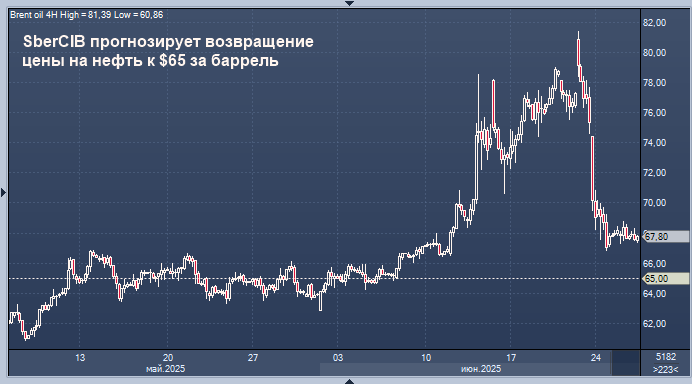 SberCIB ждет возвращения цены на нефть к $65 за баррель после планируемого в июле решения ОПЕК+ о росте добычи График нефти марки Brent интервалами в 4 часа В ближайшее время стоимость нефти может вернуться к уровню 65 долларов за баррель, считает старший аналитик SberCIB Investment Research Константин Самарин. По его мнению, краткосрочные факторы, связанные с ожиданием эскалации конфликта на Ближнем Востоке, уже не оказывают влияния на рынок. Теперь на первый план выходят более фундаментальные причины, в частности, рост добычи стран, входящих в ОПЕК+. На XVIII Всероссийском бункерном форуме эксперт отметил, что решения восьми стран ОПЕК+ об ускоренном увеличении производства пока не сильно влияют на баланс рынка. Это связано с тем, что Казахстан добывает больше своей квоты. Однако, по мнению Самарина, следующая встреча ОПЕК+ и объявление о росте добычи в августе должны вернуть цены к уровню до конфликта на Ближнем Востоке — к 65 долларам за баррель. Эксперт также подчеркнул, что фунда