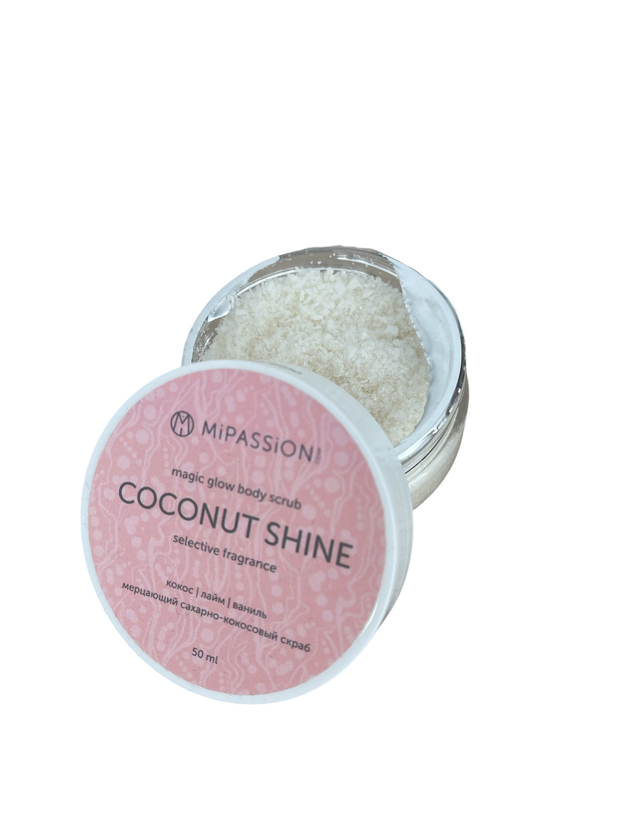 Сегодня на обзоре мерцающий сахарно-кокосовый скраб Coconut shine от российского бренда Mipassion. Он продается в пакетах с застежкой по 250 г, у меня тестовый вариант в баночке-шайбе 50 мл. Есть фольгированная защита от вскрытия. Бюджетно, но симпатично. Скраб сухой, мелкий, по консистенции похоже на смешанную мелкую или чуть дробленую кокосовую стружку с сахаром, чуть масел и мелкие блестки. Он очень деликатный, очень. Ничего толком не отскрабит, но кожа после него приятная. Пахнет очень натурально, нет жирного жира после использования, и самая главная фишка этого продукта-это мелкие серебристые блестки, которые останутся на вас, даже после смывания. Летом выглядит симпатично. Для меня это больше декоративный продукт, чем функциональный. И только на лето. Сахароза, масла в составе, натуральный. Продается и в ЗЯ и в Летуаль и на маркнтплейсах, даже в Республике. стоит рублей 350-400.