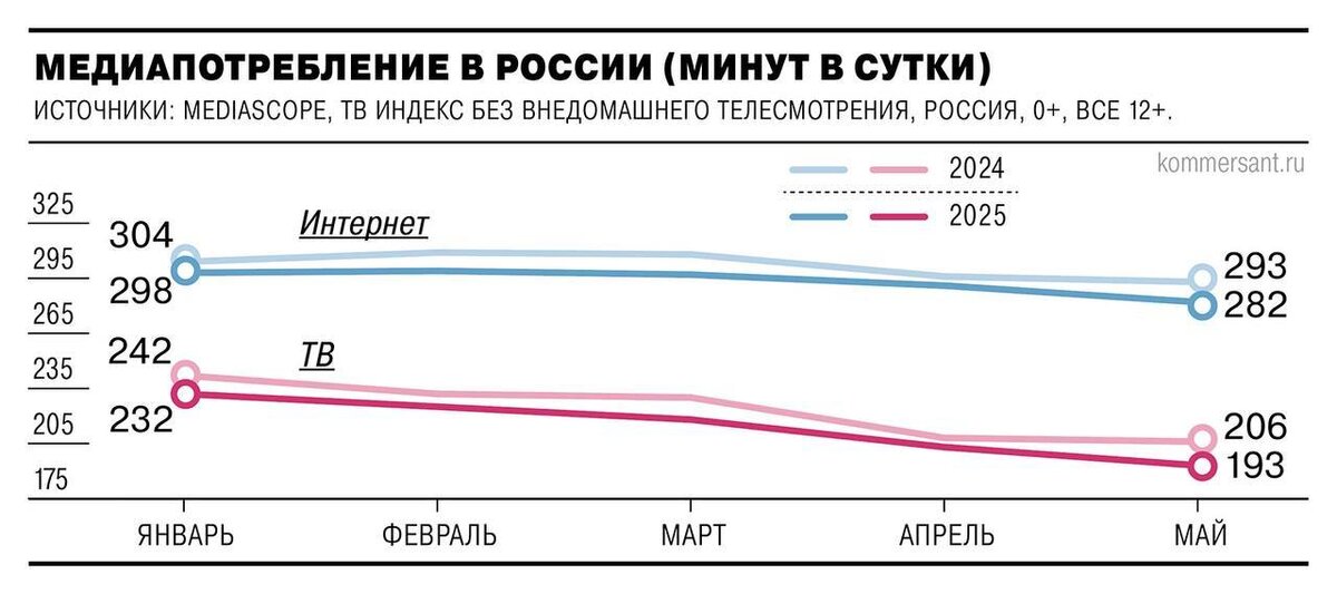 За первые пять месяцев 2025 года медиапотребление в России снизилось: время, проведённое в интернете, упало на 3%, а в сегменте онлайн-видео — сразу на 11%, — сообщает «Коммерсантъ». Эксперты связывают этот тренд с замедлением работы YouTube, который с 2024 года практически не функционирует в стране. Также, данным группы компаний (ГК) «Родная речь» и Mediascope о состоянии медиарынка и медиапотребления на июнь 2025 года, среднее время пребывания пользователей в сети в мае 2025 года сократилось на 11 минут (4%) по сравнению с маем 2024 года. Одновременно снизилась и аудитория онлайн-видео, что связано с массовым оттоком пользователей с YouTube — одной из крупнейших интернет-платформ России. Кроме того, среднее время просмотра ТВ упало с 206 минут в 2024 году до 193 минут в 2025 году. На фоне ухода YouTube российские видеоплатформы демонстрируют стабильный рост, но пока не способны конкурировать с зарубежными платформами. По итогам марта 2025 года лидерами видеохостингов в России стали: