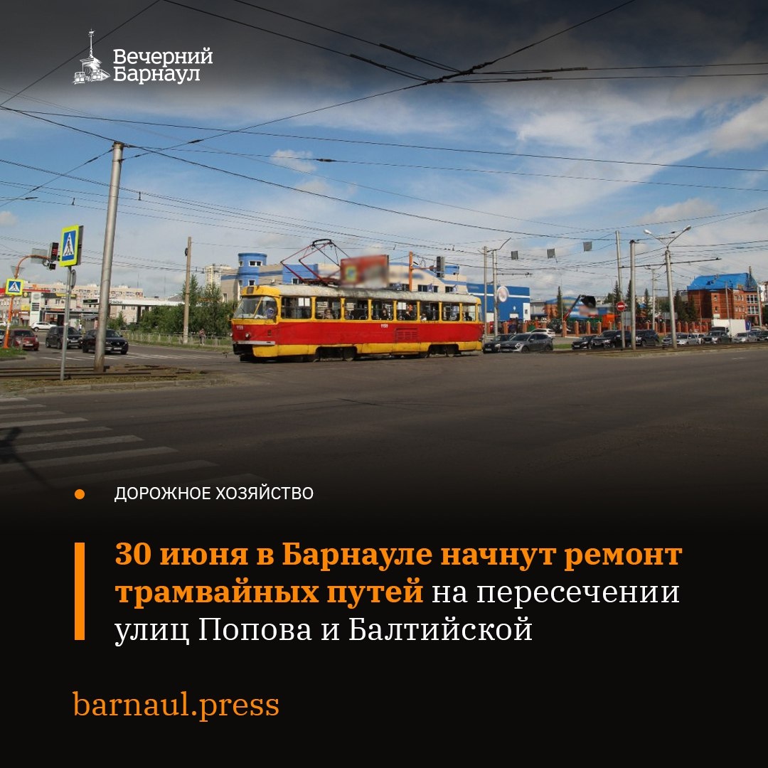 Поздним вечером 30 июня на пересечении улиц Попова и Балтийской в Барнауле приступят к ремонту трамвайных путей.