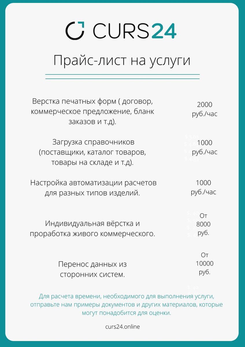 🎯 Новости CURS24: мы растём — и теперь можем делать ещё больше для вашего бизнеса! Мы рады сообщить, что наша команда пополнилась двумя новыми специалистами: ✅ Анастасия - Менеджер внедрения и сопровождения. Теперь, чаще всего, вы будете общаться в WA и Telegram с Анастасией. ✅ Всеволод - Инженер-программист Теперь мы можем предложить вам услуги по внедрению и дальнейшему ведению профиля вашей компании в системе CURS24 , чтобы вы могли сосредоточиться на развитии бизнеса, а не на технических деталях. 💼 Что мы можем делать за вас: ✅Добавление прайс-листов поставщиков: загрузим и структурируем цены. ✅Обновление каталога товаров: будем регулярно актуализировать номенклатуру. ✅Контроль цен и склада: загрузим и обновим остатки материалов, проставим актуальные цены. ✅Автоматизировать расчёты изделий. ✅Вёрстка печатных форм. ✅И многое другое по вашему запросу. 📈 Почему это удобно? ✅Вы экономите время и силы: всё, что связано с данными и настройкой, берем на себя. ✅Получаете профессиона