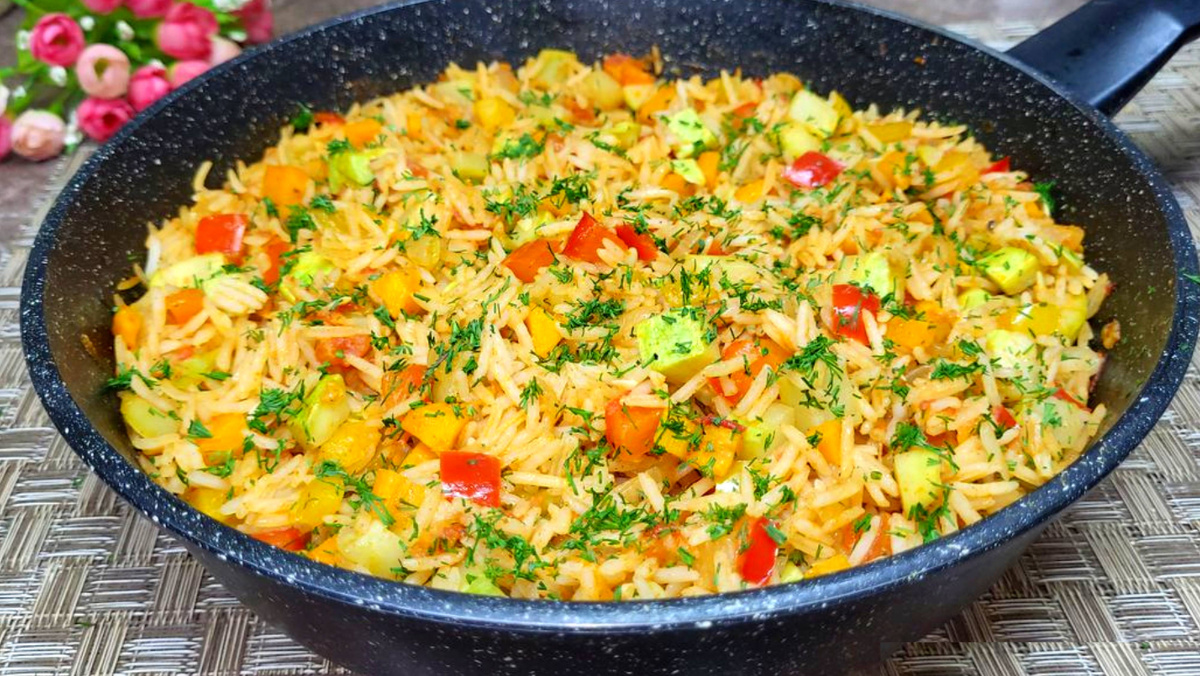 Это блюдо из кабачков готовится очень просто, а получается очень вкусно. Так же его можно использовать как гарнир. Приготовление: 1. Ставлю на плиту кастрюлю с водой. Солю воду и довожу до кипения. 2. Рис хорошо промываю в проточной воде. Для этого блюда предпочитаю использовать рис Басмати. 3. Добавляю рис в кипящую воду и варю до готовности, минут 20. 4. Затем сливаю воду и рис промываю холодной водой. 5. На сковороду наливаю растительное масло и хорошо разогреваю его. 6. Лук и морковь нарезаю небольшими кубиками и отправляю на сковороду. Обжариваю овощи на среднем огне , помешивая, минут 5-7. 7. Сладкий перец нарезаю также , кубиками, и отправляю на сковороду. Обжариваю, помешивая, 4-5 минут. 8. Кабачок нарезаю кубиками и отправляю на сковороду к овощам. 9. Помидоры заливаю кипятком на минут 3-5. Снимаю шкурку. Помидоры нарезаю кубиками и отправляю на сковороду к овощам. 10. Перемешиваю все овощи на сковороде и обжариваю 5-7 минут. 11. Добавляю соль, паприку, черный перец, хм