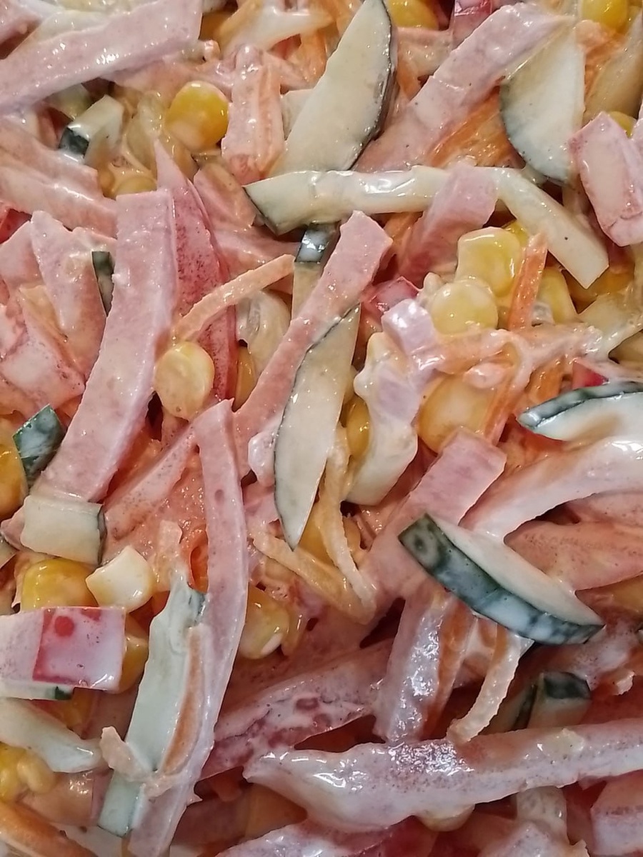 Салат "Красота" Сегодня День Рождение сына и мы приготовили один из наших любимых салатов. Рецепт очень простой, но салат получается обалденно вкусным. Ингредиенты: Огурец свежий 1 шт. Помидоры свежие 2 шт. Кукуруза консервированная 1 банка. Морковь по-корейски 150 -200 г. Колбаса полукопченая 200-300 г. Майонез по вкусу Я обычно всё кладу на глаз, так что пропорции примерные. Приготовление: Огурцы и помидоры моем, нарезаем соломкой. Колбасу тоже нарезаем соломкой. Всё складываем в салатник Добавляем туда же морковь по-корейски и кукурузу. Заправляем майонезом и всё хорошо перемешиваем. Приятного аппетита!