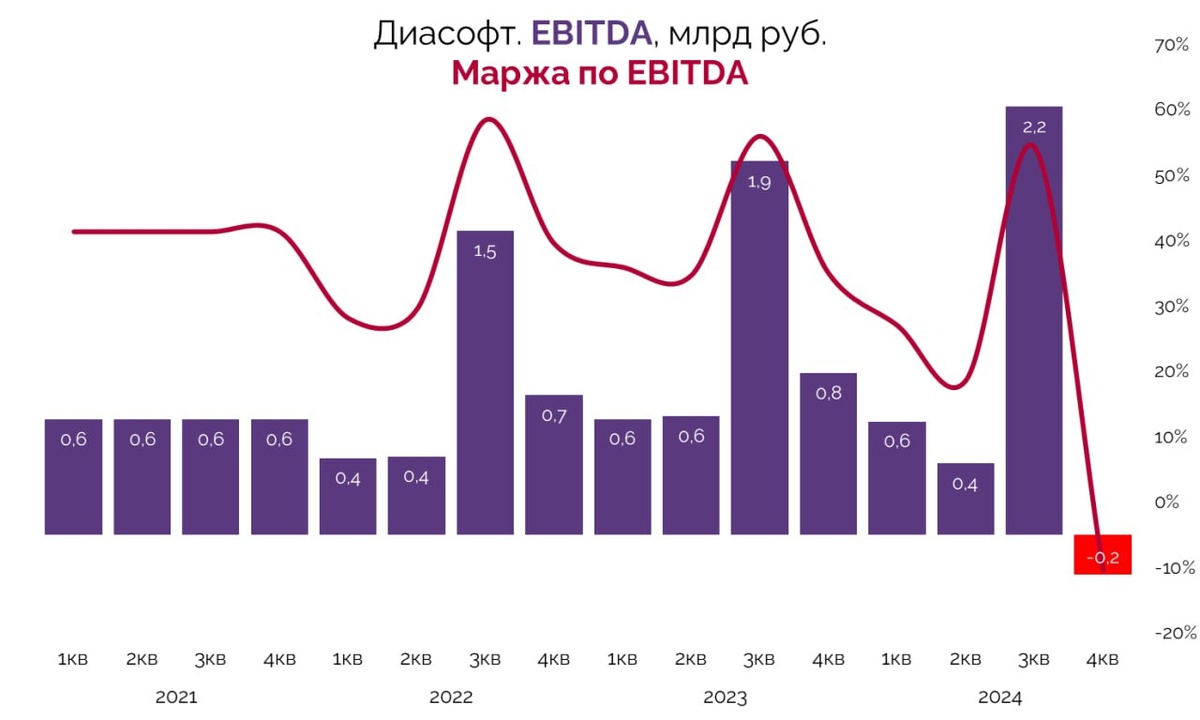 📲 Почему Диасофт не смог показать обещанный рост выручки на 40%? Сегодня вышел отчет за 2024 финансовый год. Вместо обещанных еще на IPO +40% по выручке акционеры увидели всего лишь 10%. Что же так сильно повлияло на результаты компании? Выручка в 10,1 млрд руб. оказалась под давлением следующих факторов: — Перенос сроков закрытия крупных проектов на текущий год и длинные циклы продаж на новых рынках ; — Задержка импортозамещения ПО в средних и малых банках; — И не менее важное — 1,4 млрд руб. выручки было перенесено на 2025 год. 📉 Рост расходов на персонал и перенос выручки снизил финансовые результаты: EBITDA составила 2,9 млрд руб. (-24,7%). Рентабельность по EBITDA составила 29,3%. Чистая прибыль снизилась 21,7% — до 2,4 млрд руб. Долг все еще отрицательный (ND/EBITDA = -0,4х). Свободный денежный поток акционеров за год составил 0,3 млрд руб. при выплате дивидендов в размере 2,6 млрд руб. за год. Компания выплатила все привлеченные на IPO средства — около 2,3 млрд руб. На 20