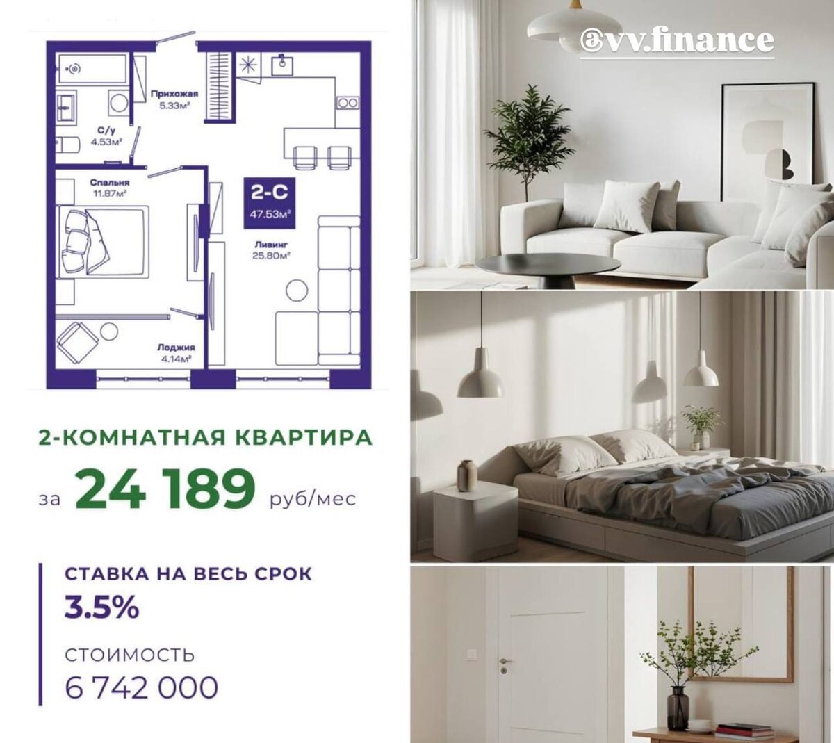 Квартира со ставкой 3.5%? 🔥ДА! Двухкомнатная квартира со сдачей дома в этом году! 47.53 м2, просторная кухня-гостиная, спальня с лоджией, гардеробная, большая ванная комната — все это про нее😍 Ставка по семейной ипотеке 3.5% Стоимость 6 742 000₽ Первый взнос 1 355 000₽ Ежемесячный платеж 24 189₽ О проекте: • соседский досуговый центр • двор-сад без машин • гамаки и и дорожки для прогулок • кладовые • колясочные • стрит-ритейл Локация с прекрасной экологией и инфраструктурой. Дендропарк за окном и озеленение внутренних территорий разными видами растений позволит любоваться красками природы в любое время года. Свяжитесь с нами 👈🏻 Расскажем подробнее и сделаем расчеты!