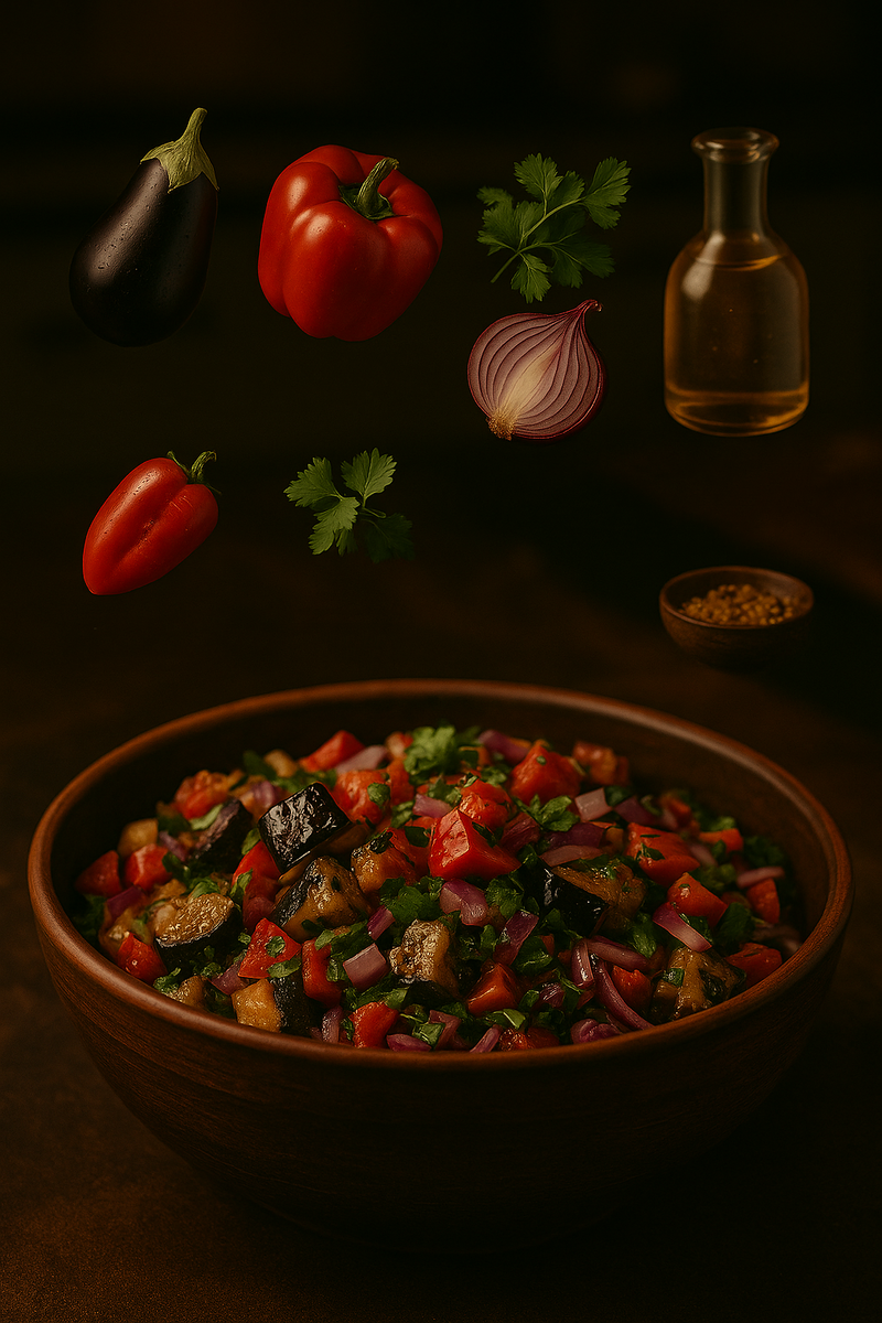 Мой любимый салат для дачи. Он будто вобрал в себя дух летних посиделок у мангала. Немного дыма, свежести и восточных нот — попробовав однажды, будете готовить всё лето! Мангал-салат называется так, потому что его главный фокус — овощи, приготовленные на мангале. То есть не просто свежие или тушёные, а именно обжаренные на углях, как шашлык. Это придаёт салату вот тот самый дымный аромат и слегка подкопчённый вкус, который не спутаешь ни с чем. Такой салат часто делают «на месте» — пока мясо жарится, овощи рядом подпекаются, и через 10 минут у тебя готова и закуска, и гарнир к шашлыку. Можно сказать, это шашлычный салат, только без мяса. Настоящая летняя классика. ⏱ Время приготовления: 20–30 минут 🔥 Особенность: овощи запекаются на мангале (можно и в духовке) Ингредиенты: P.S. Овощи можно обжарить на решётке или запечь в духовке — вкус будет яркий и насыщенный в любом случае! Как готовим: Добавляем нарезанный кубиком лук, мелко рубленую зелень и выдавленный чеснок. Запр