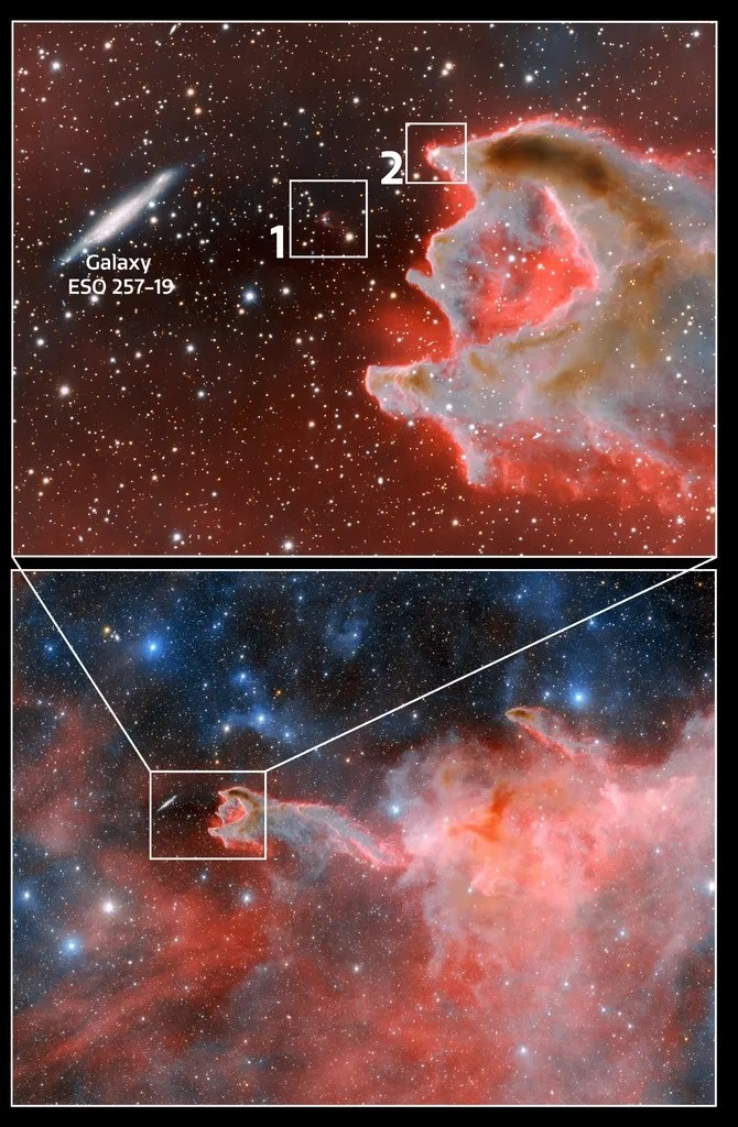 Крупный план CG 4, который выглядит так, будто собирается поглотить видимую с ребра спиральную галактику ESO 257-19 (PGC 21338)