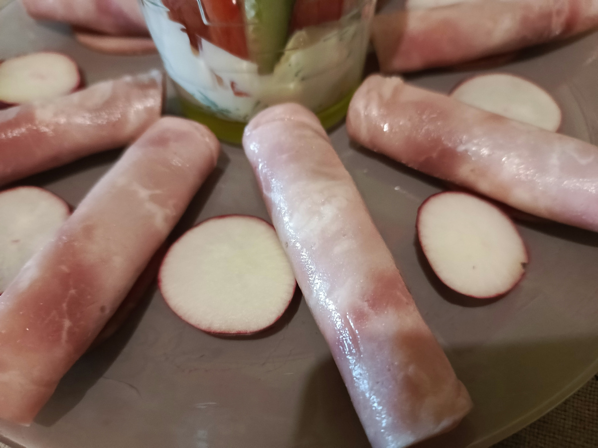 Берем нарезанную тонко ветчину и одну половину смазываем творожным сыром. На сыр выкладываем листочки рукколы. Заворачиваем в рулет. Закуска готова!