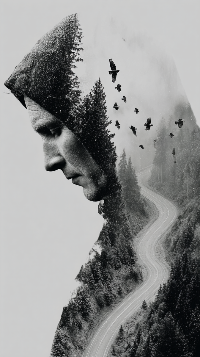 Black and white double exposure of a hooded man silhouette holding his head, overlaid with multiple shots of birds flying over a winding road and dense forest. High contrast lighting with deep shadows and bright highlights, film grain effect. Inspired by Sebastião Salgado and Lilian Bassman. Hyper-realistic, emotional, moody portrait. --ar 9:16 --stylize 750