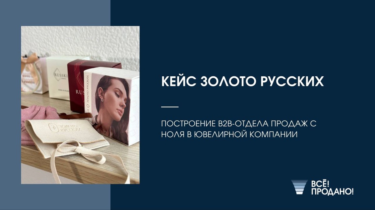 от компании «Все! Продано!» О клиенте: «Золото Русских» — российский производитель ювелирных украшений с более чем 15-летней историей, 200 000 проданными изделиями и клиентами по всему миру. Владелица бренда Анна Русских успешно выстроила B2C-направление, но пришла к нам с вопросом, который стал отправной точкой большого изменения: «Могу ли я продавать те же украшения в сегменте B2B?» На тот момент у Анны уже были единичные продажи по корпоративным заказам — индивидуальные ювелирные изделия для клиентов её знакомых. Было ощущение спроса, но отсутствовала система. Задача: Запустить B2B-продажи с нуля. Минимальным составом. Без авантюризма. Проверить гипотезу «холодные продажи». Этап 1. Старт с головы: аудит и стратегия Перед тем как предложить решение, мы провели аудит текущих ресурсов и потенциала: Результат: гипотеза подтвердилась. У компании есть ресурс, спрос, логистика и возможность масштабировать через B2B. Этап 2. Строим с фундамента: разработка модели отдела продаж Мы понимали,