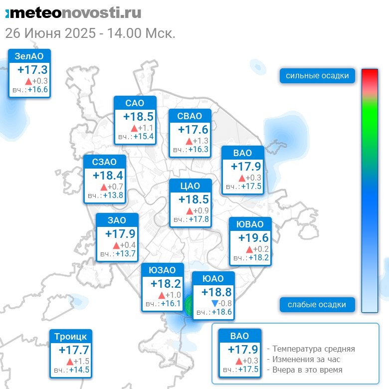 В 14:00 в Москве было от +17.1°C до +20.7°C, средняя температура +18.4°C #погода #Москва #лето #температура #26июня #четверг Перейти на сайт Прогноз погоды на 14 дней