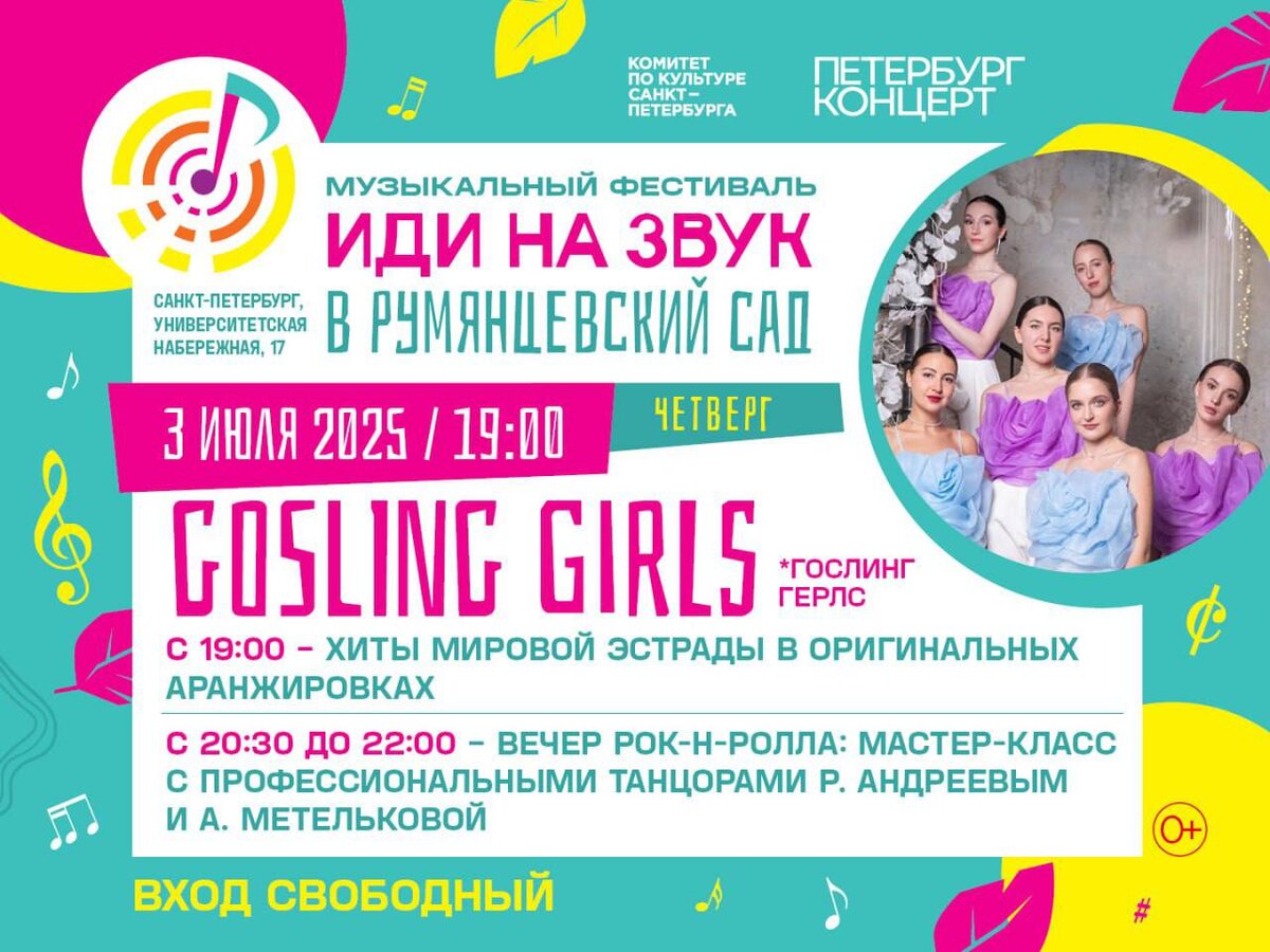 Хиты мировой эстрады в оригинальных аранжировках молодого мультистилевого коллектива а капелла Gosling Girls — 3 июля на фестивале «Иди на звук!» в Румянцевском саду! Коллектив Gosling Girls смело переосмысливает классические произведения и создает собственные авторские композиции, которые удивляют своей оригинальностью и радуют безупречным исполнением. Шесть очаровательных участниц (все – профессиональные музыканты) покоряют зрителей не только вокалом, но и яркими образами и костюмами! Несмотря на то что коллективу всего несколько лет, он является обладателем Гран-при международного конкурса Я-Star, приза зрительских симпатий конкурса «Московская A CAPPELLA», а также лауреатом 2-й степени «Битвы хоров» — 2024 в Сочи. По окончании концерта — с 20.30 до 22 часов — всех желающих принять участие в зажигательных мастер-классах на танцплощадке ждут настоящие чемпионы танцевального олимпа, молодые талантливые преподаватели школы рок-н-ролла Роман Андреев и Александра Метелькова. Вход сво