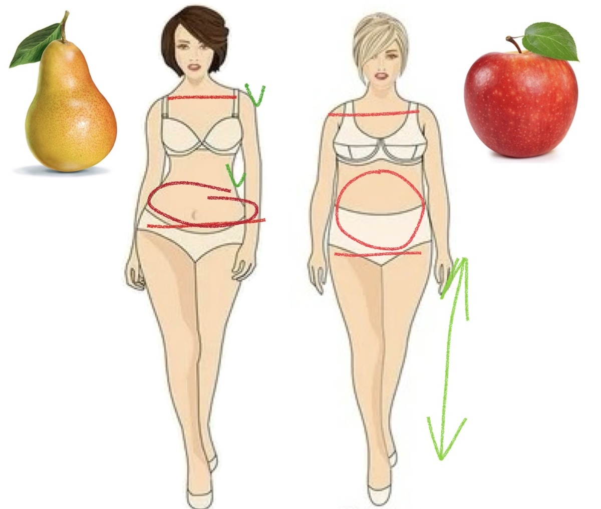 - Особенности: Узкие плечи, широкие бёдра, тонкая талия, живот ниже линии талии.