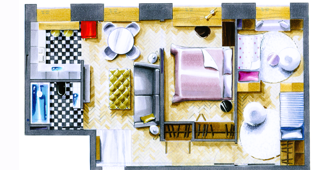 Особенность квартиры — отсутствие несущих стен, что дало простор для фантазии. Единственным архитектурным элементом, который пришлось сохранить, стала массивная балка, проходящая через всю квартиру. Эта балка стала своеобразным «скелетом» интерьера — вокруг неё выстроилась вся концепция зонирования.