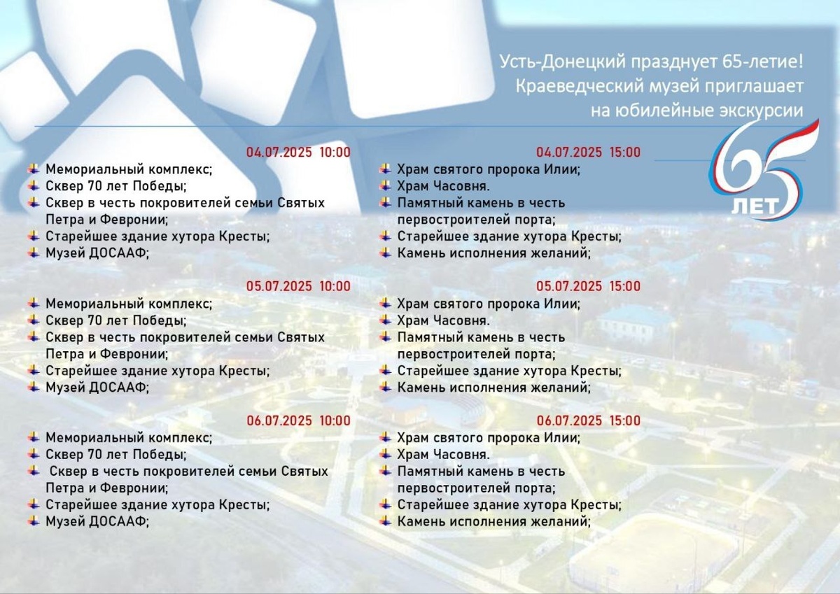 Усть-Донецкий празднует 65-летие: Краеведческий музей приглашает на юбилейные экскурсии! Что вас ждёт: • Пешеходные экскурсии по знаковым местам • Уникальные факты о становлении посёлка • Истории о людях, создававших Усть-Донецкий Почему стоит пойти: → Узнать малоизвестные страницы истории → По-новому взглянуть на знакомые улицы → Разделить праздник с земляками Как присоединиться: 📞 Запись по телефону: 8-928-192-1555 (Татьяна Павловна) 👉 Подробнее о юбилейных мероприятиях: https://clck.ru/3MoVUC #УстьДонецкий65 #ЮбилейРодногоКрая #ИсторияРядом #НашМузей