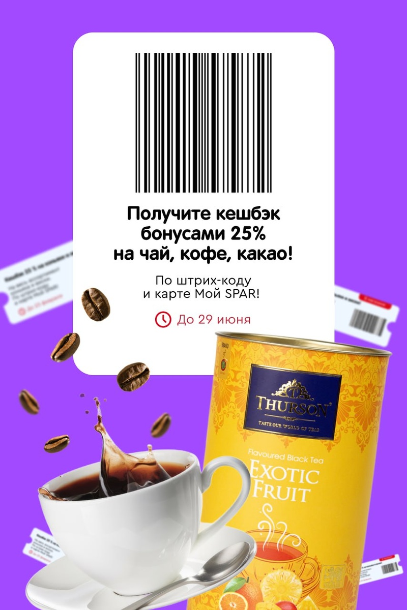 С 26 до 29 июня у вас есть шанс получить кешбэк 25% бонусами* на карту Мой SPAR за покупки! Используйте купоны и покупайте выгодно: чай, кофе, соусы, алкоголь и многое другое! Как воспользоваться: 1. Отсканируйте товары на кассе 2. Отсканируйте купон со штрихкодом 3. Отсканируйте карту Мой SPAR ❗️Купоны действительны только при покупке в супермаркетах SPAR и EUROSPAR. А если у вас еще нет карты Мой SPAR, то скачайте приложение и следите за новыми акциями в разделе Мои скидки. Начните совершать выгодные покупки уже сейчас! *дополнительный кешбэк бонусами суммируется с основным начислением бонусов! 1 бонус = 1 рубль! Каким купоном воспользуетесь?