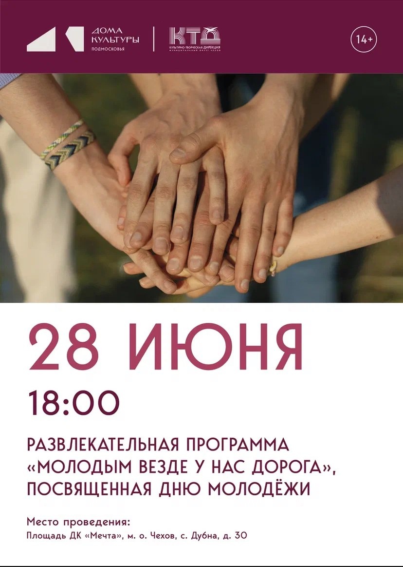 ✨ 🎈 Развлекательная Программа для Молодёжи 🎊 🔥 Добро пожаловать на праздничную вечеринку, посвящённую Дню молодёжи, организованную специально для тех, кому ещё море по колено и жизнь полна ярких эмоций! 🚀 Приходите в ДК «Мечта», чтобы весело провести вечер, поучаствовать в весёлых конкурсах, раскрыть свои таланты и потанцевать под любимые треки! 😁 Здесь каждый сможет показать себя, проявить креативность и завести новых интересных знакомых. ✨ Убедитесь сами, почему молодым действительно везде дорога! 📅 Когда: 28 июня 2025, ⏳ Начало: 18:00. 📍 Где: ДК «Мечта», с. Дубна, дом №30. ☝️ Если погода преподнесёт сюрприз, действо пройдёт прямо внутри Дома культуры! 💃 Вход абсолютно бесплатный — приходите всей компанией и наслаждайтесь праздником молодости вместе с нами! 👉 Прислать новость 💥 Проект "Чехов Детям"
