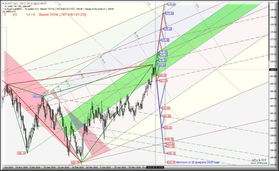 Развитие движения EUR/JPY-Daily в июле 2025 года продолжится в зависимости от отработки и направления пробоя границ зоны равновесия (168.00 – 169.60 – 171.55) вил младшего операционного масштаба Minute-h4.