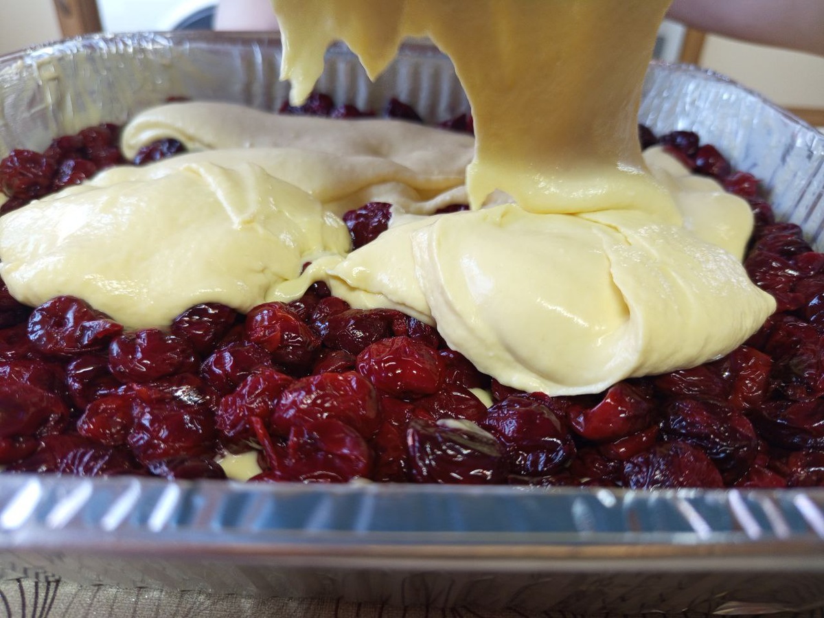 На него выкладываем всю вишню и сверху выливаем остатки теста. Духовка должна быть разогрета до 180 градусов. Выпекать около 60-70 минут.
