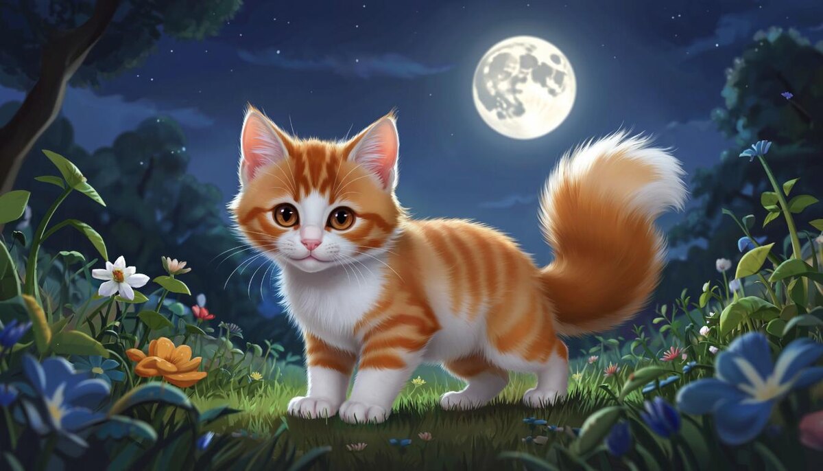 Летняя ночь была наполнена мягким лунным светом, который отражался от капелек росы на траве сада. В таком свете деревья казались загадочными великанами, их длинные тени медленно скользили по дорожкам, будто танцевали молчаливый танец со временем. Котёнок по имени Слэш осторожно выпрыгнул из открытого окна дома — первый раз в жизни он решился отправиться в ночное путешествие самостоятельно. Его большие любопытные глаза, внимательно изучали незнакомый мир вокруг. Его бело-рыжая шёрстка, мягкая и блестящая, словно шёлковая ткань, освещалась лунным сиянием. Особенно выделялся пушистый хвостик, похожий на маленькую кисточку художника, оставляющую следы света там, где он проходил. Слэша окружала летняя ночь: ароматы цветов смешивались с запахом влажной земли после недавно прошедшего дождя, воздух был свежим и прохладным, а лёгкий ветерок нежно теребил белые усики. Тишина нарушалась лишь тихими звуками природы — шелестом листьев, стрекотанием кузнечиков да далёким криком ночной птицы. Котён