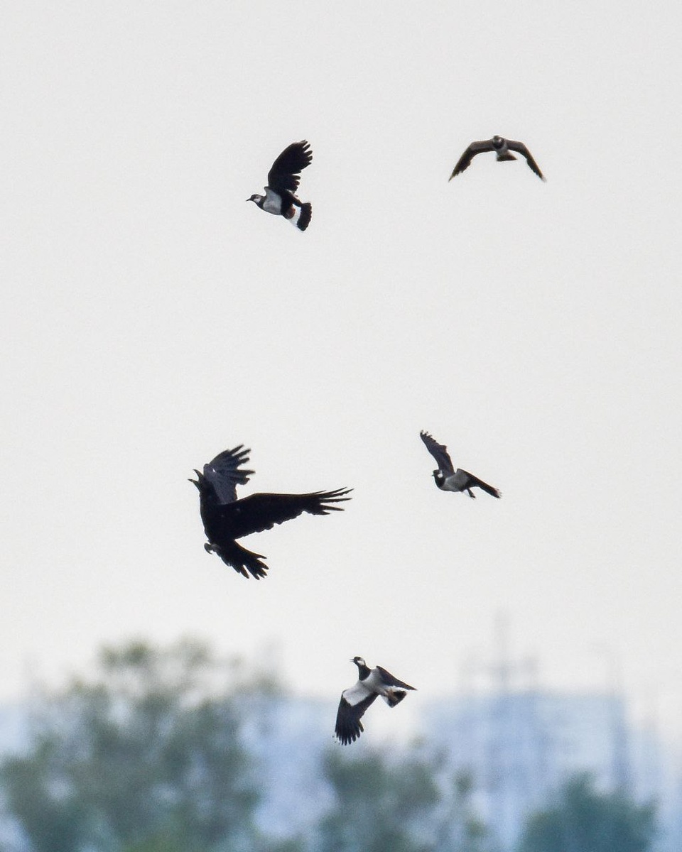 #ПтицаДня Несу вам свою птицу дня - ворона, гонимую чибисами. Начало этой драмы я не видела, поэтому не знаю случайно ли ворон оказался над полем, где гнездятся чибисы, или это была спланированная акция в поисках еды, но, кажется он сильно пожалел об этом. Гоняли его от 5 до 10 чибисов одновременных: одни садились, другие взмывали в небо, дабы прогнать угрозу их потомству. Чем всё закончилось? Ворона выгнали с поля, а чибисы переключились на других хищников. #птицы #Ворон