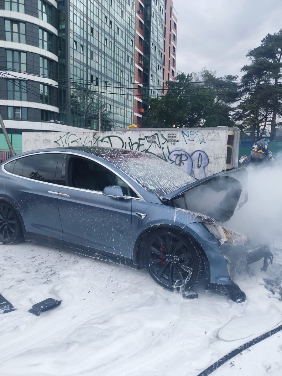 Tesla загорелась на парковке в Одинцовском округе Сигнал о загоревшемся автомобиле Tesla на автостоянке в деревне Сетунь Малая в Одинцовском округе поступил вчера, 25 июня, в «Систему-112» от очевидцев. Прибывшие на место огнеборцы ПСЧ-246 Мособлпожспас обнаружили, что пламя охватило переднюю часть автомобиля. Ситуация осложнялась тем, что в электроавтомобилях при возгорании может происходить «тепловая разбежка» — опасная цепная реакция аккумуляторов. Спасатели действовали быстро: подали ствол, локализовали огонь и не дали ему перекинуться на соседние авто. К счастью, в машине никого не было. Повреждены аккумуляторный блок и передняя часть. Пострадавших нет, причина устанавливается. Источник