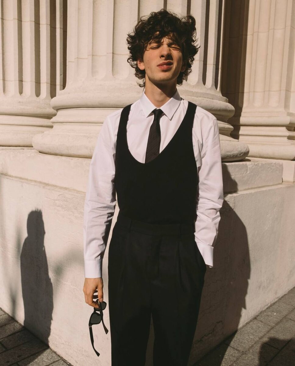 Актёр и любимчик мировой модной тусовки Марк Эйдельштейн демонстрирует идеальный модный трюк на прошедшем показе Saint Laurent: плотная майка в сочетании с классической рубашкой и галстуком. И, конечно, сразу же хочется вспомнить съемку Марка в тотал-образе от Elyts.ru для журнала «Кинорепортёр». Черно-белая классика, но с таким твистом.