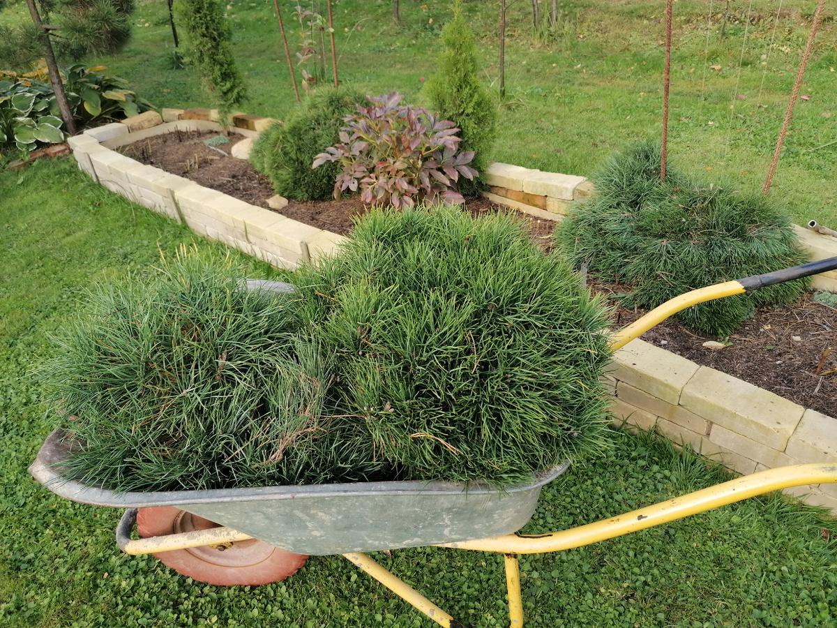 Вот фото прошлой осени после стрижки лишнего, я развожу в тележке зимний "утеплитель" по саду: