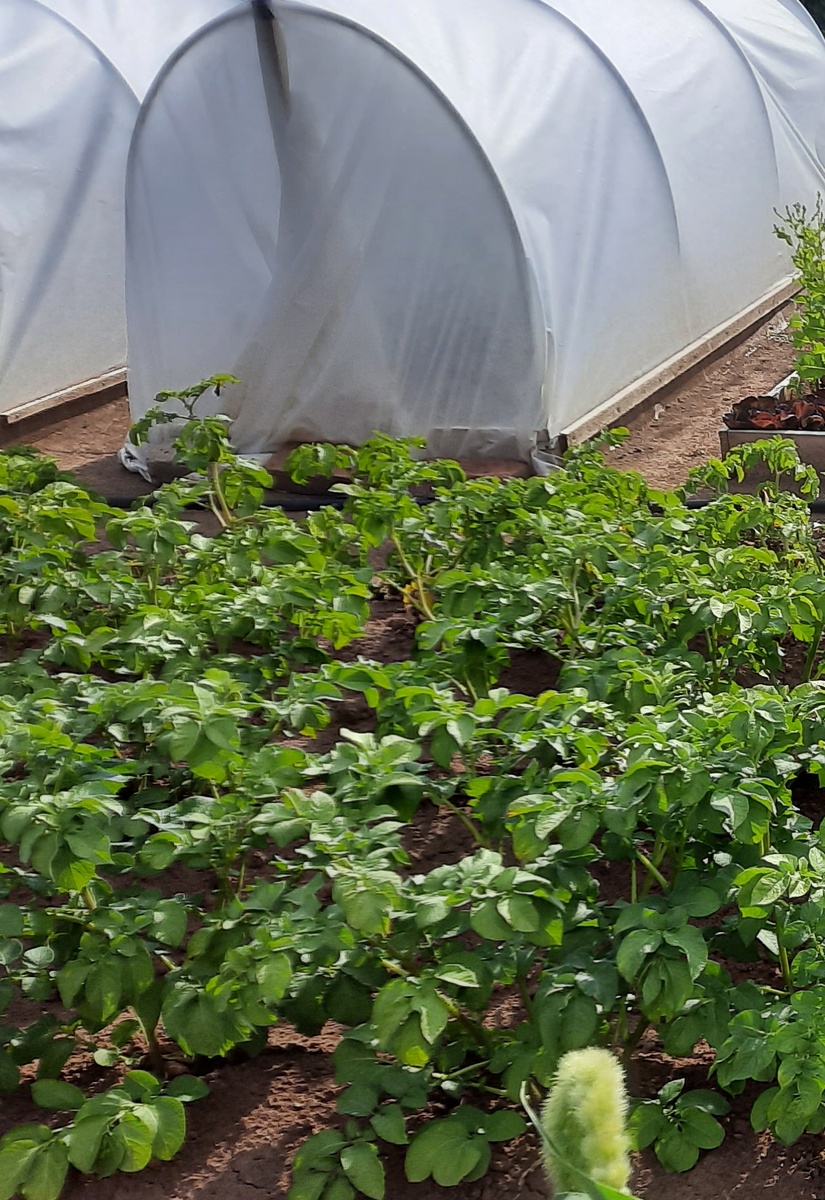 Как же все-таки быстро пролетел июнь с 30 градусной жарой и "великой сушью"в первой половине месяца,а затем с ливнями и холодными ночами. Вчера еще дождь лил как из ведра,а сегодня с раннего утра светит солнышко. Пока нет дождя,решила навести сегодня порядок в огороде. Огород у меня небольшой.Занимает чуть больше сотки земли на участке. Теплицы у меня нет,так как я бываю в саду наездами,работаю. Открывать и закрывать теплицу никто ко мне "не нанимался". Поэтому сделали прошлой весной парники с укрытием из спанбонда. Пока меня они вполне устраивают. Закрыты,когда меня нет.Растения в них на солнце не "варятся",от ливней защищены. Выращиваю я в них томаты,перцы и огурцы.Но в этом году огурцы у меня в "свободном плавании" на грядке. Высадила больше перцев. На томатных кустах уже есть помидорки,хотя высаживала я рассаду месяц назад 22 мая,восле возвратных заморозков. Под корнеплоды,лук и зелень сделано шесть трехметровых грядок. Сегодня прорыхлила после вчерашнего дождя грядки с морков
