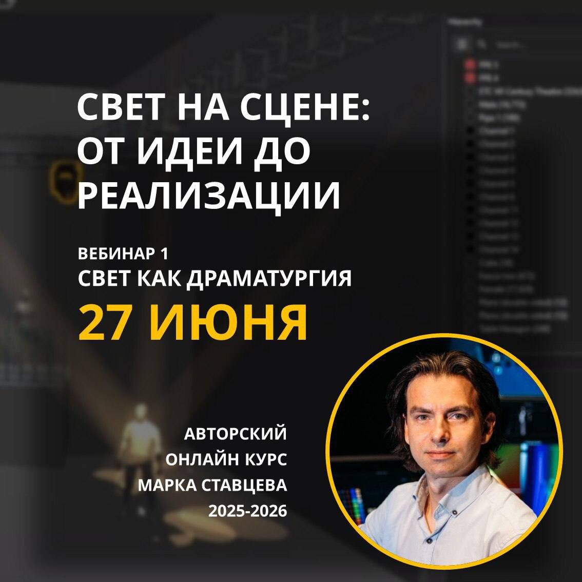 😮 Откройте для себя искусство сценического света вместе с Марком Ставцевым! Уже завтра, 27 июня — старт уникального онлайн-курса, посвящённого современному сценическому освещению: от технических нюансов до световой драматургии. 🎭 Тема первого вебинара: «Свет как драматургия» 📹 Вебинар пройдёт в прямом эфире на YouTube, но попасть на трансляцию можно только по ссылке, которую мы отправим после регистрации. Также мы пригласим вас в закрытый чат участников, где будет живое общение и поддержка от Марка. 🔗 Подробнее о программе и регистрация ссылке ⬅️