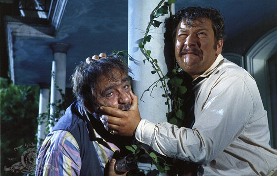 Кадр из фильма «Топкапи» (1964), в котором Устинов (на фото справа) играет роль мелкого афериста Артура Симпсона. Живописный персонаж, которому герой Устинова затыкает рот, вечно пьяный (Медведев, не смотрите этот фильм!) повар Жервен, в блестящем исполнении Акима Тамирова. За роль в «Топкапи» Питер Устинов получил «Оскар».