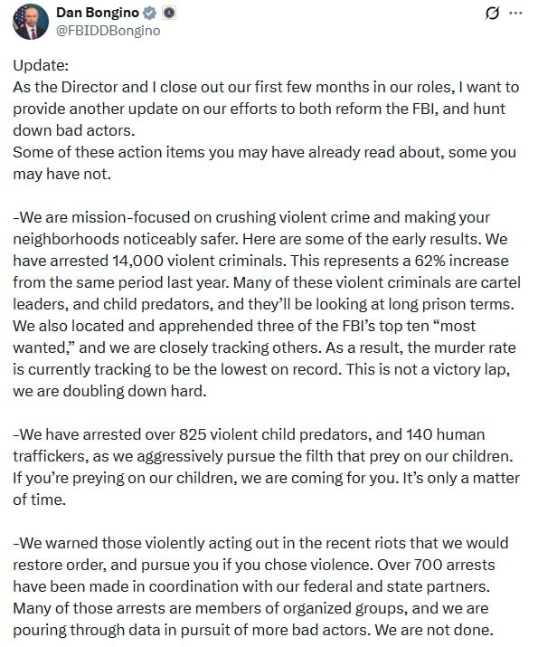 FBI Director posts MASSIVE list of accomplishments – 14,00 violent criminals arrested – 825 child predators taken off the streets – 700 rioters cuffed But still no EPSTEIN FILES