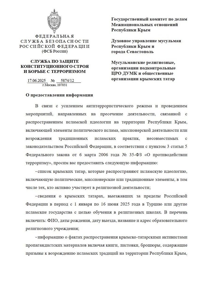 ФСБ борется с экстремизмом в Крыму. ФСБ запросила данные о крымских татарах, распространяющих исламскую идеологию, включая поездки в религио