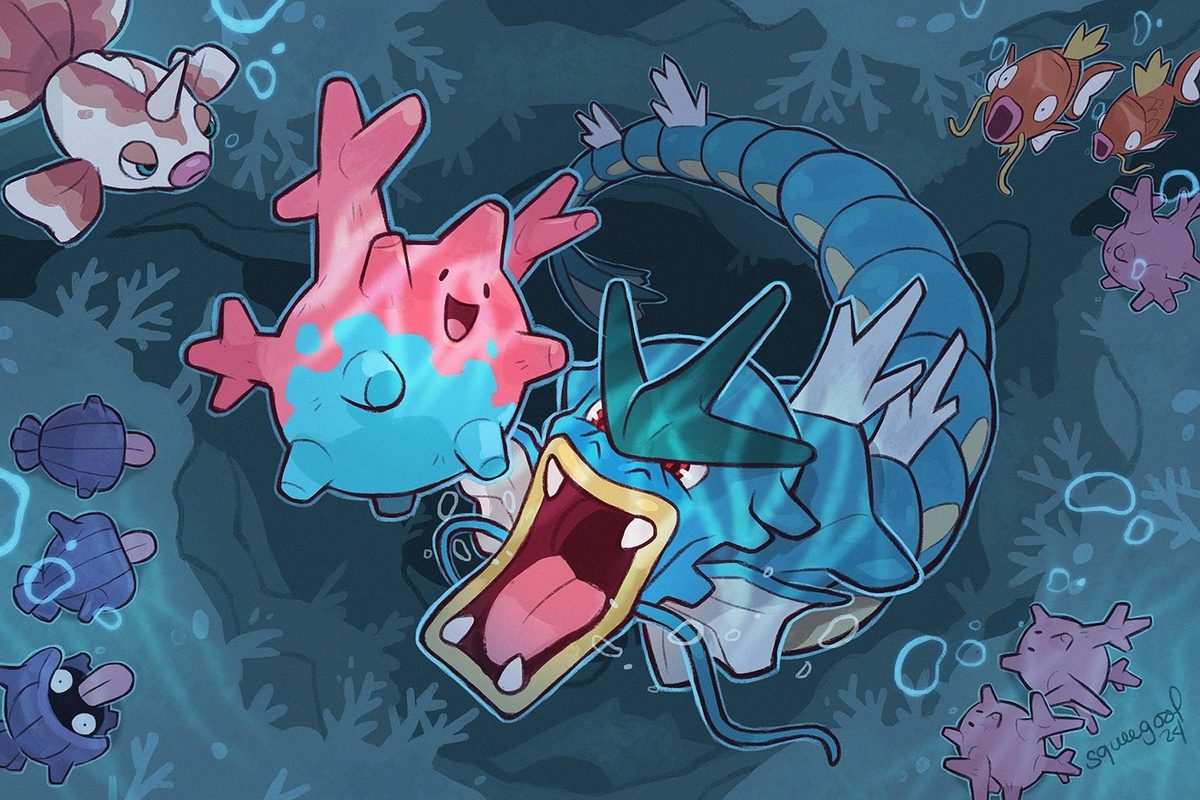 🎨 Художник: squeegool @PokePikaProject ✏️ Теги: #air_bubble #bubble #corsola #goldeen #gyarados #horns #magikarp #no_humans #open_mouth #pokemon #pokemon_(creature) #red_eyes #shellder #signature #single_horn #squeegool #teeth #tongue #tongue_out #underwater